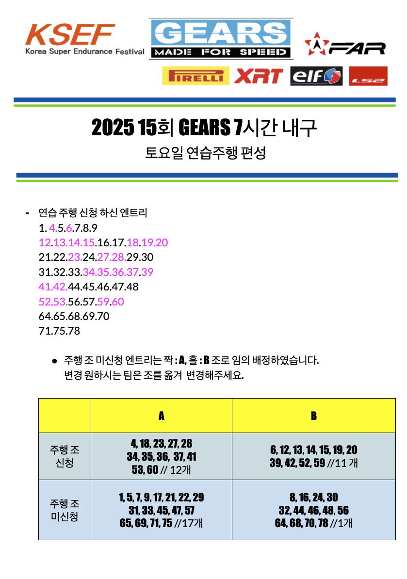 2025년 15회 GEARS 7시간 내구 페스티발 연습주행 조편성